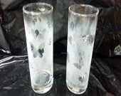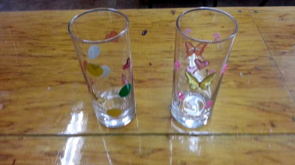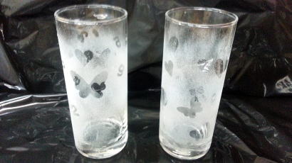 グラス・お皿に模様を書いて硅砂を吹き付けて作ります。追加は1個、約500円。ウェディングの名前入れや文字入れ、オリジナルの模様描きいろいろできます。とっても簡単にシールを張るだけでもできるし、本格的に絵を描いて下図を作ってもいいし、文字や絵を簡単に綺麗にコピーできます。