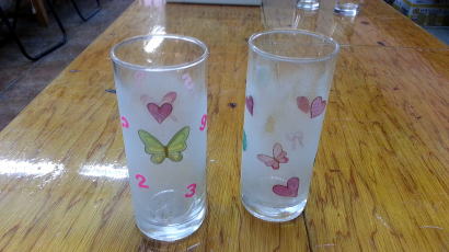 1.始めにグラス等にシールを張ったり絵を描きます。