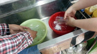 製作時間120分。1.グラスにシールを張ったり、模様を書きます。 2.サンドブラスターで硅砂を吹き付けて作ります。約5分、簡単です。 3.水で洗い流しシールをはがします。 4.全部終わった後でジュース等で乾杯します!