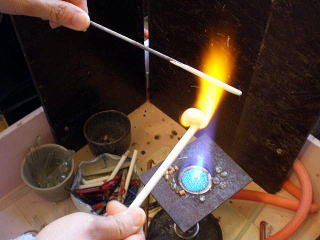 ガラス初めての方向けです。バーナーを使ってガラスを溶かし、小さなものから確実に技術をあげて何でも作れるようにしていきます。ガラスを溶かして作ることがメインになってきます。トロトロに溶けたガラスを操り慣れてくるととんぼ玉の他、動物玉やミニ吹きガラスでおちょこもできます。主にとんぼ玉、小玉、花玉、水中花、ミニチュア、パーツ制作をしていきます。