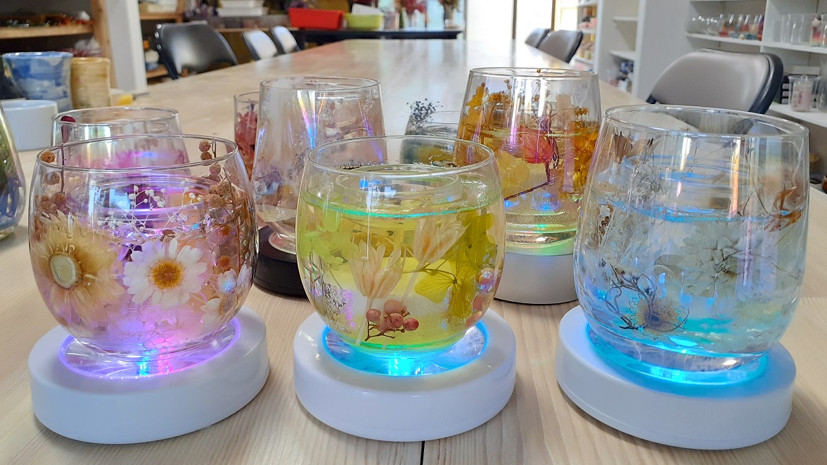 ジェルキャンドル体験作品。中にはキャンドルの代わりにLEDライトを入れたりもできます。隙間の厚さで入れれるお花の厚みや数が違ってきます。